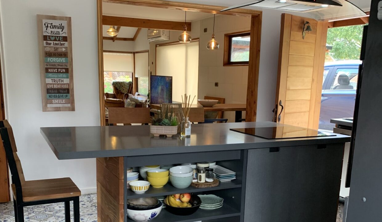 La cocina es moderna e iluminada, tiene pisos de cerámica y vista al volcán Villarrica, posee una gran isla con cocina encimera eléctrica, espacio de almacenamiento en su interior y 4 sillas altas. Está considerado en el equipamiento de la cocina un refrigerador de dos puertas, lavavajillas, horno eléctrico y campana.