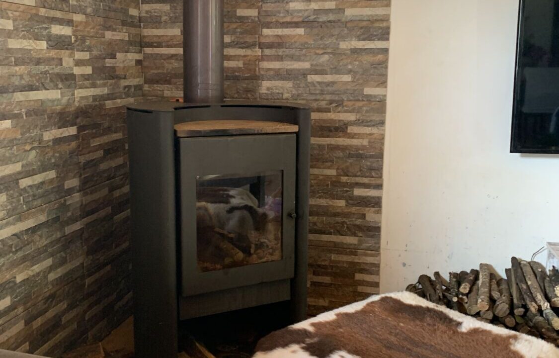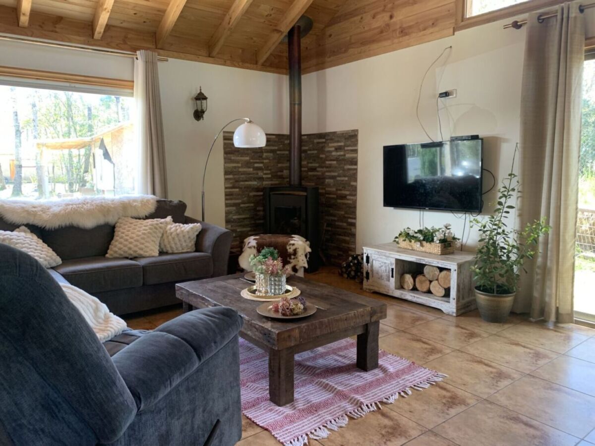 La cabaña es de 36m2 tipo estudio, 1 ambiente con un separador para el dormitorio, cocina americana, baño completo con ducha pileta, estufa de combustión lenta a leña.